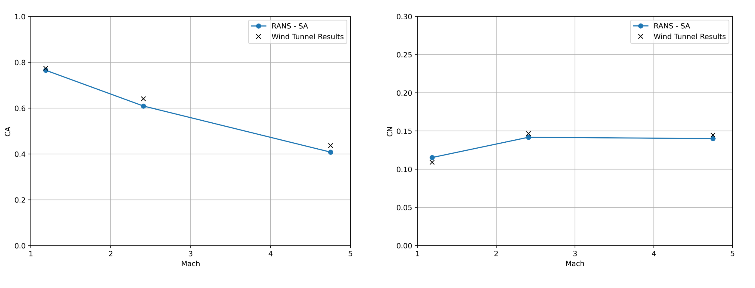 This section presents the validation of the aerodynamic results for the rocket configuration against the reference data [1]. The analysis focuses on two primary nondimensional coefficients used in the original work: the axial force coefficient, \(C_A\), and the normal force coefficient, \(C_N\). These quantities provide a consistent basis for assessing the aerodynamic performance of the vehicle across the range of operating conditions considered. In addition to the integrated force coefficients, selected flow-field visualizations are included to illustrate the converged solutions and to support a qualitative discussion of the underlying flow physics.
