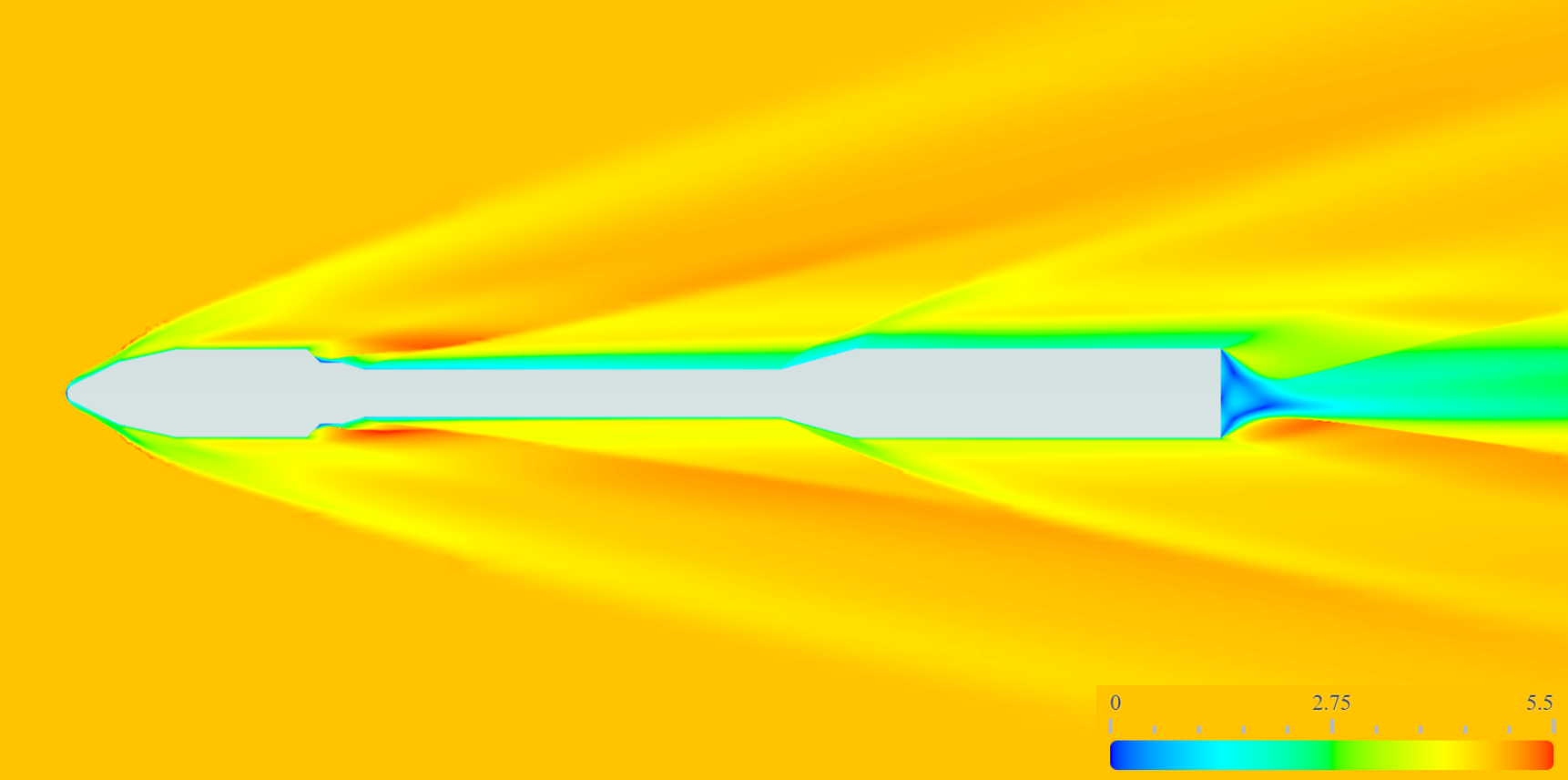 Operating in the transonic and supersonic regimes introduces flow phenomena that are both highly nonlinear and strongly coupled, including shock-induced separation, large pressure gradients, and unsteady wake interactions. These effects can have a significant impact on aerodynamic loads and stability characteristics, particularly for configurations featuring geometric discontinuities such as payload fairings, steps, or diameter changes. Accurately capturing these phenomena places stringent requirements on numerical methods, turbulence modeling, and grid resolution.